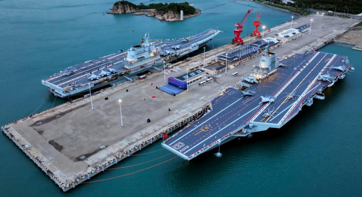 而在总吨位已然突破300万吨大关的中国海军这里,光是一支南海舰队,基本就已经足以实现对整支英国皇家海军的实力碾压。还是以到2025年底的统计数据来看,南海舰队拥有2艘现役航空母舰,分别为6万吨级的首艘国产航母“山东舰”,以及新锐的8万吨级国产电磁弹射型航母“福建舰”,另有2艘被视为准航母的4万吨级075型两栖攻击舰。若再算上5艘单舰吨位不低于2万吨的071型两栖船坞登陆舰,那光是这9艘大型作战舰艇的吨位,就已经来到了不低于35万吨的水平。