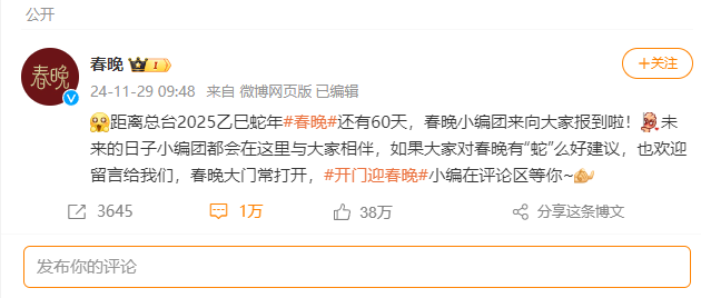 “希望大家能够提好意见,春晚的大门向大家打开,我们在评论区等你哦”。