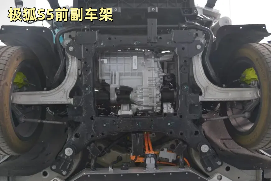 T1的因为我没有实际看到,但看这张图片可以看出,车架处在相较电机更低的位置,行驶中发送碰撞是前置与更低位置的副车架先发生接触,对电机、电池起到相应的保护作用。