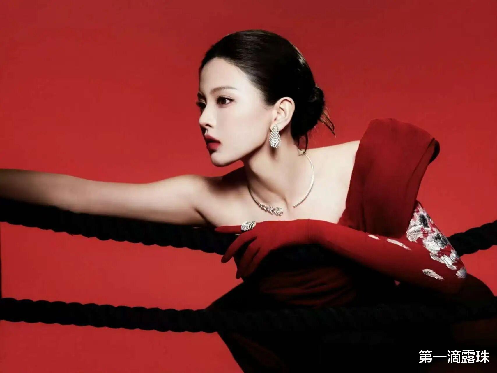 和沈月一样,杨超越的造型同样别出心裁。杨超越礼服最显著的特点,是红与黑的强烈撞色。