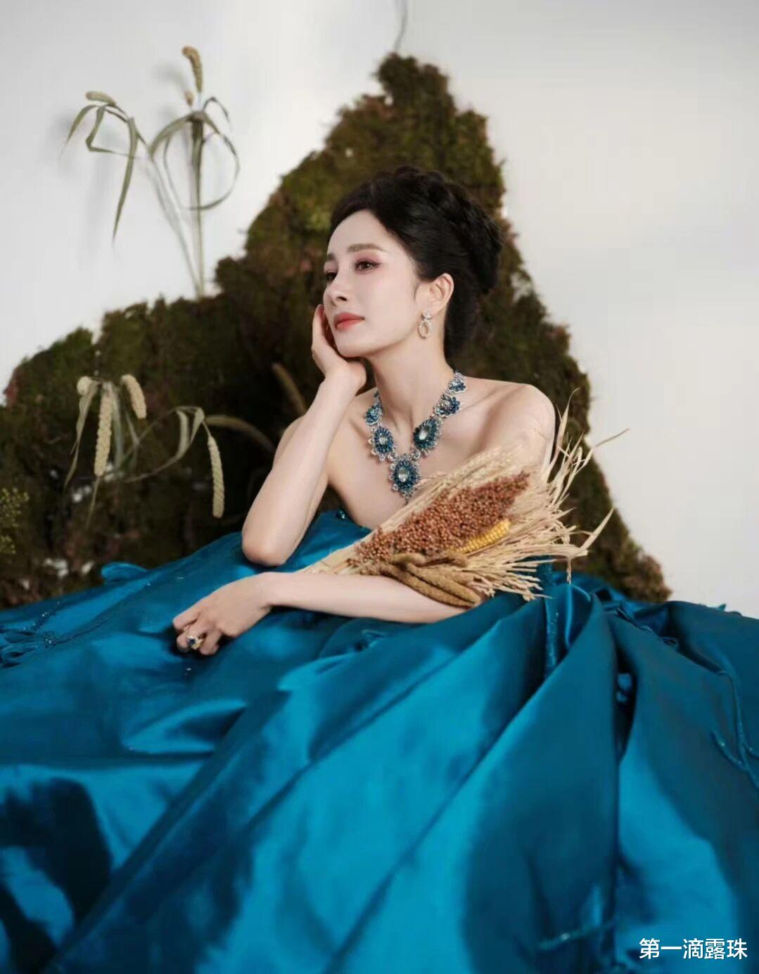 杨幂身穿的秋冬定制系列湖水蓝花朵刺绣塔夫绸礼服,采用抹胸剪裁,搭配立体花朵与蝴蝶结装饰,整体呈现出蓝孔雀般的华贵大气。
