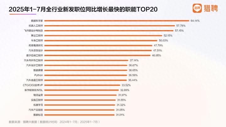 今年1月-7月同比增长最快的TOP20职能中,数据科学家以64.14%的同比增速高居榜首,算法工程师(52.15%)、数据建模(36.65%)和机器学习(31.32%)等典型AI岗位均进入TOP20。