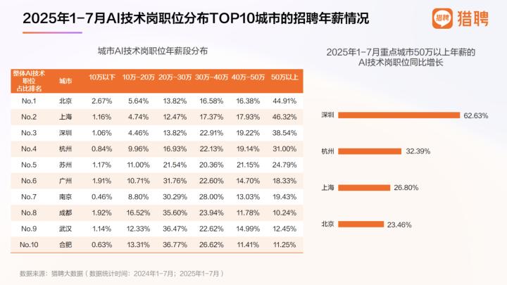从这四个城市50万元以上AI技术职位在今年1月-7月的同比增长来看,深圳以62.63%的增速遥遥领先;杭州以32.39%的增速位居第二。