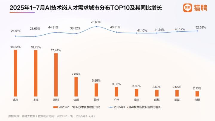 在招聘中明确提出要求掌握AI工具的职位数量正呈现爆发式增长。猎聘大数据显示,今年1月-7月,同比增长率达152.27%。