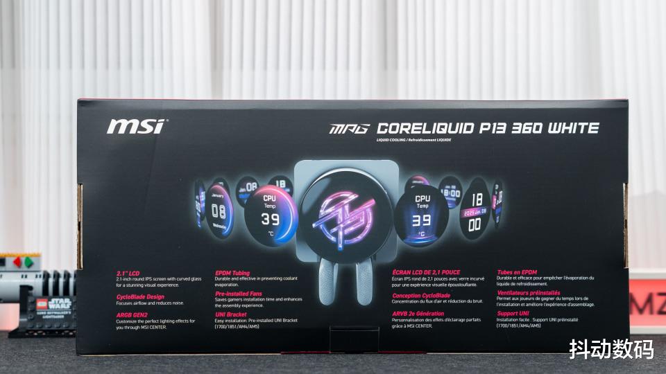 包装背面则详细地解释了自定义LCD冷头屏幕设计,需特别指出的是,微星公司开创性地率先实现了将水冷散热器冷排顶部的LCD显示屏直接作为独立显示器使用的创新应用。