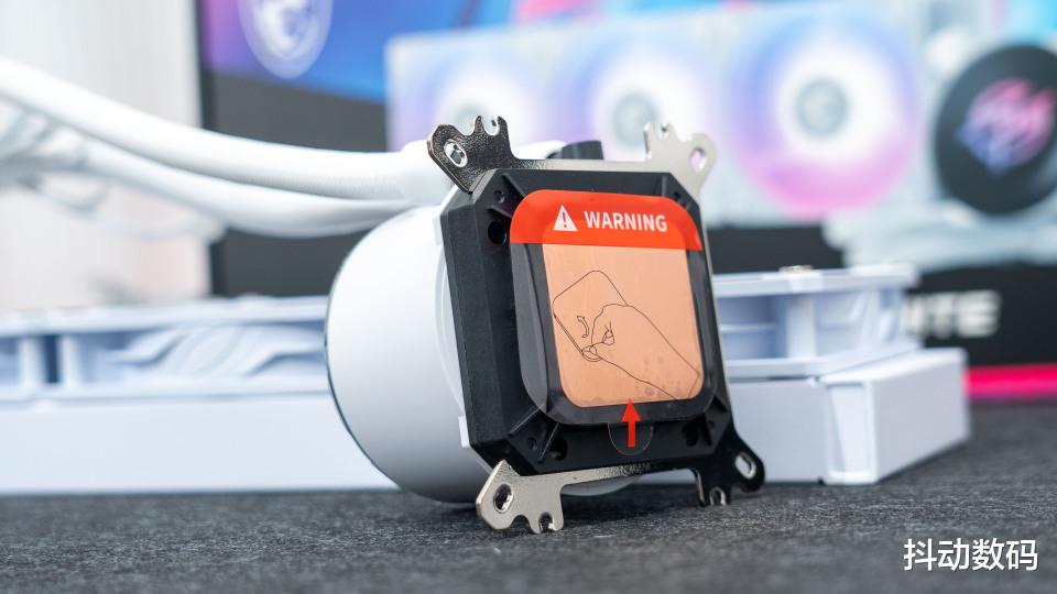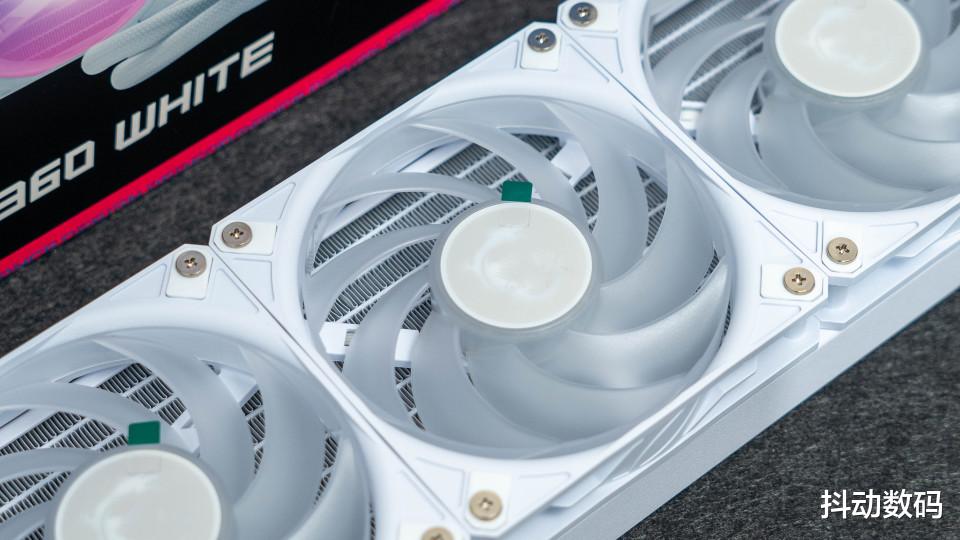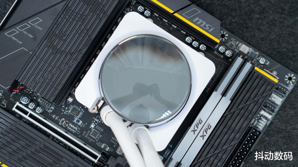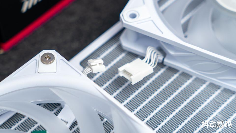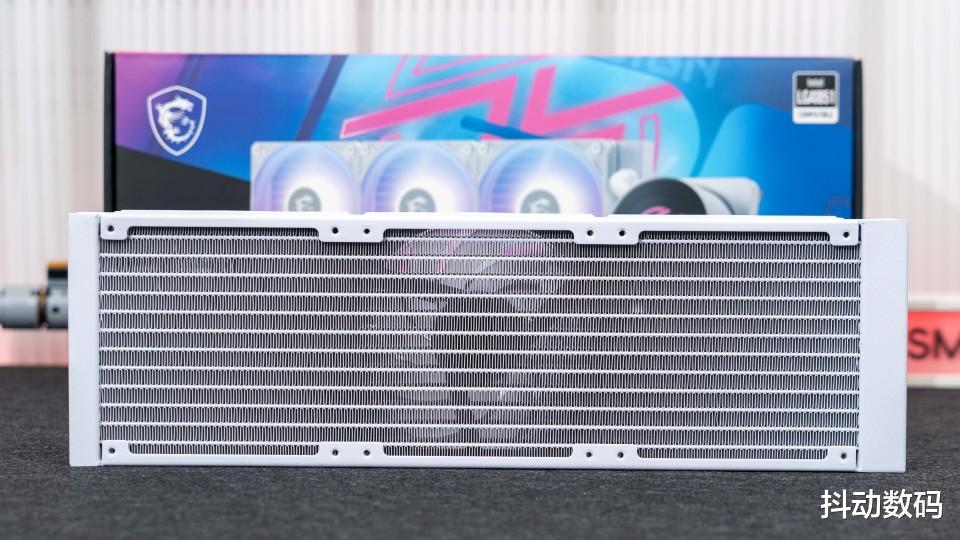 另一侧可以看到白色的冷排,冷排整体表面平整。冷排内部采用了Z字型冷排鳍片设计,低密度水阻冷排设计。
