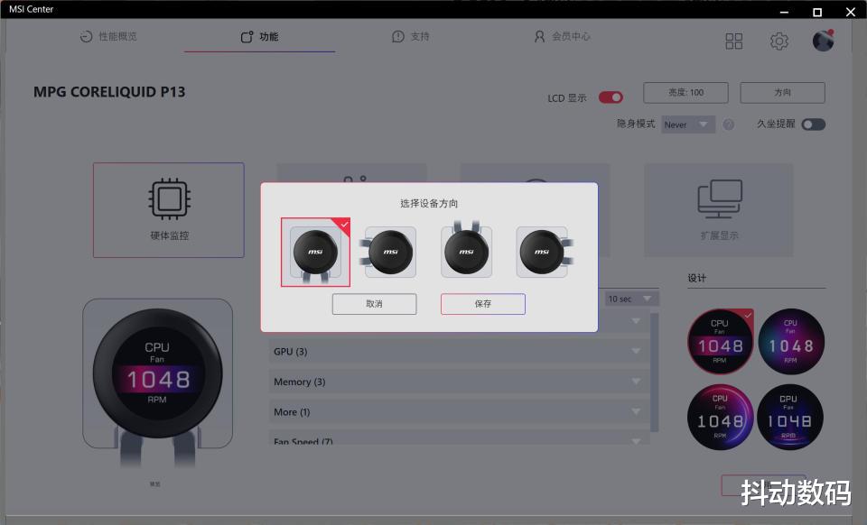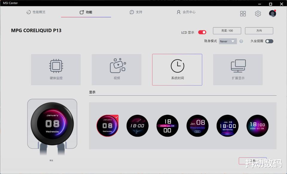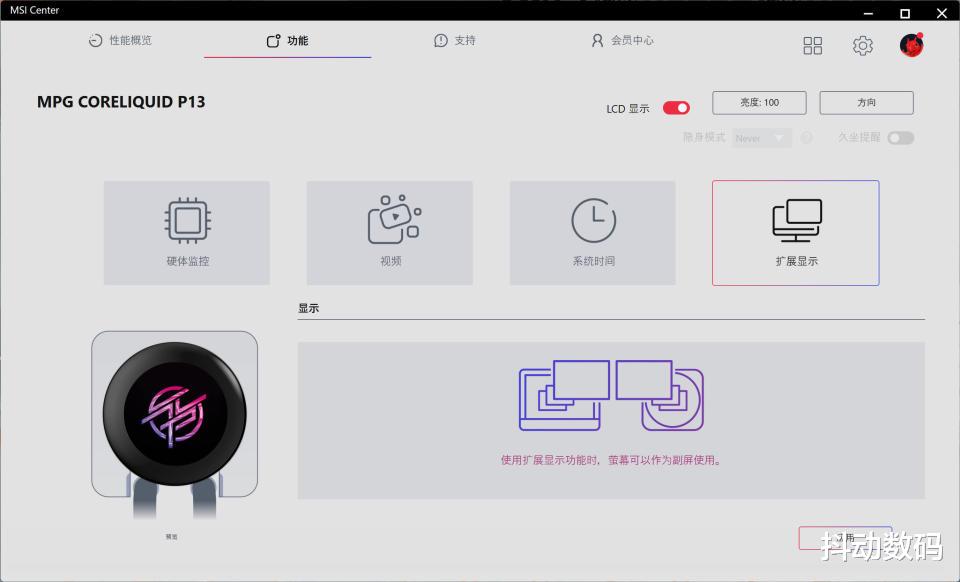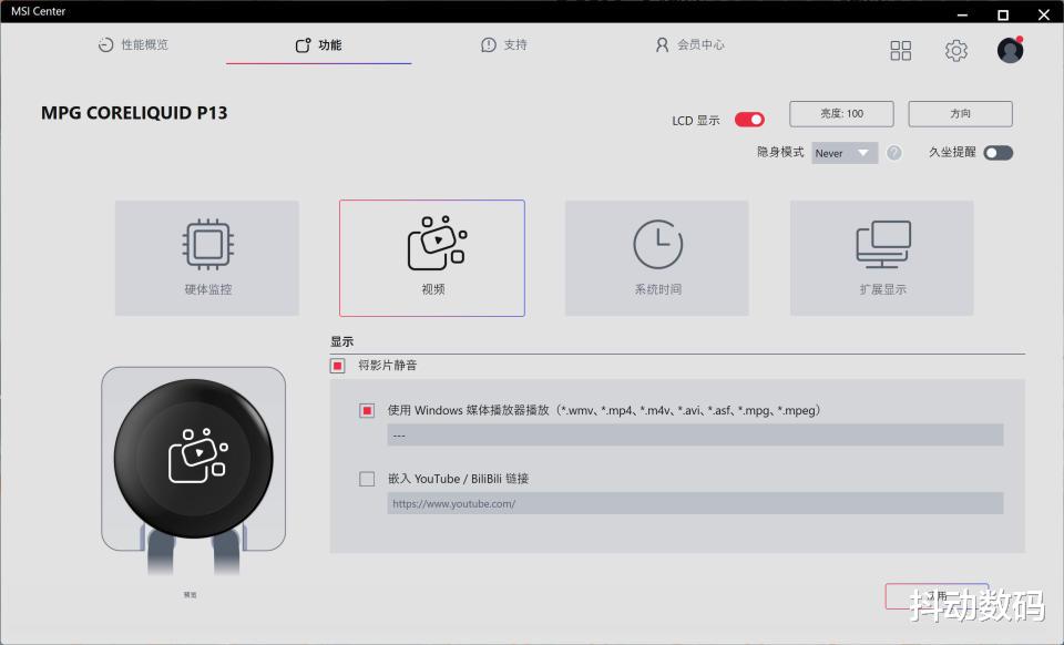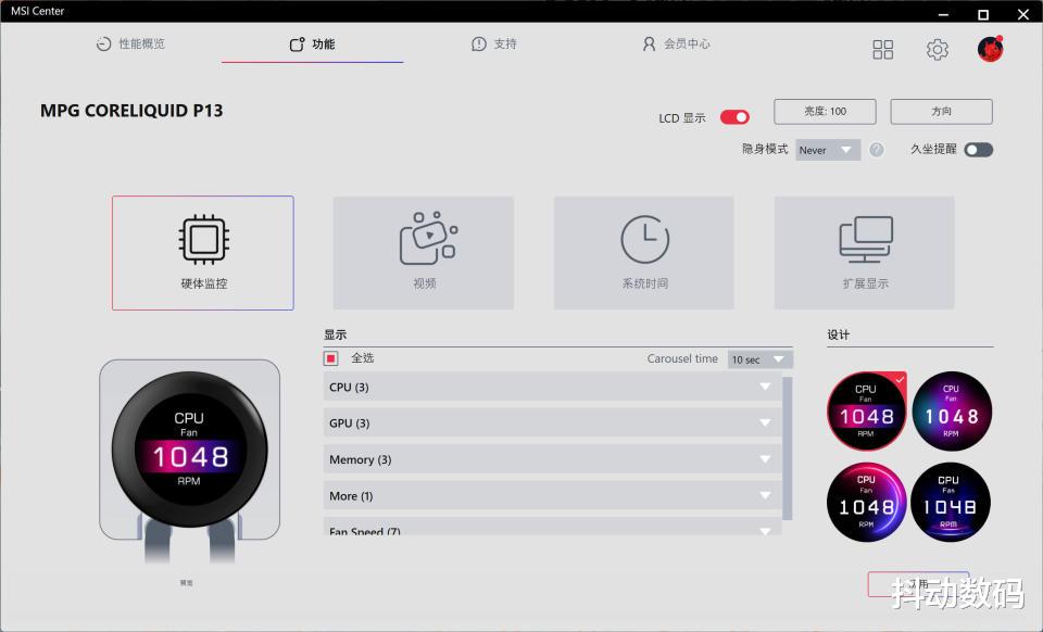 软件控制方面搭配MSI自家的Certer软件就可以对冷头LCD屏幕进行设置,可以自定义硬件监控、视频、系统时间或者直接作为扩展显示使用。