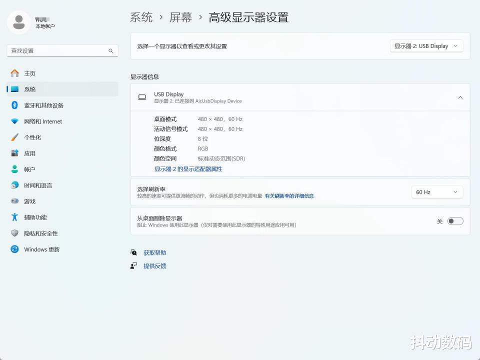 进入高级显示器设置可以看到这块显示器是由USB连接的,分辨率为480*480,刷新率为60Hz,整体表现我觉得很是很惊艳的。