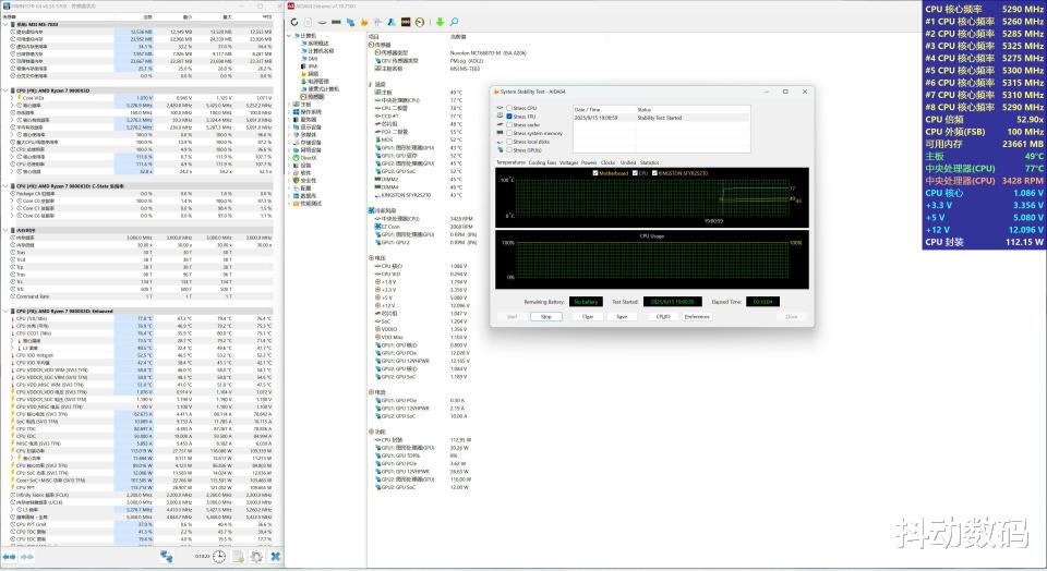 实测搭配9800X3D处理器测试可以看到,AIDA 64 FPU单烤测试下处理器频率5.30GHz,TDP 113W,处理器核心温度77℃,处理器峰值温度80℃。这样说明MPG CORELIQUID P13 360 这块水冷散热器的整体散热表现是可以压制9800X3D这样处理器的散热的。