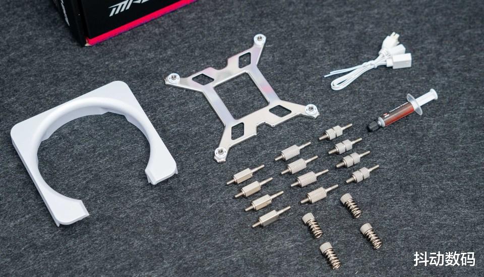 出厂预装风扇设计,这也是目前一体式水冷产品的主流设计了。这样玩家在装机的时候也更方便,另外的一个牛皮纸盒是全部扣具附件。