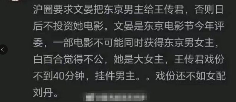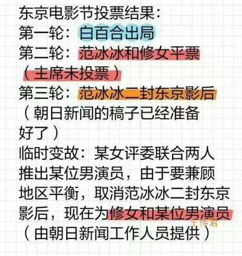 那么评委为什么要针对中国女演员而去捧有争议的王传君?有网友称评委文晏和范冰冰本就有矛盾,而且自己不想不能和范冰冰同台。