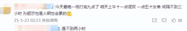 这样的高强度赛程对任何运动员都是严峻考验,球迷感慨到,孙颖莎这参赛情况,两场间隔没多长时间,莎莎也是会累的。