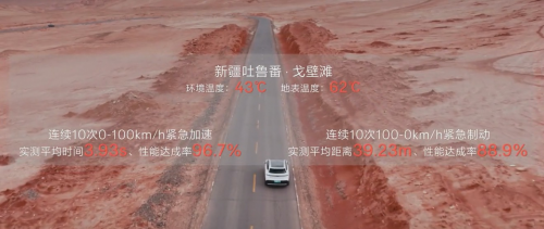 但我们从极氪 7X 本次吐鲁番高温测试下看到了,在地表温度62℃、环境温度43℃的极端环境下,连续10次0-100km/h紧急加速,实测平均时间3.93s,性能达成率96.7%;连续10次100-0km/h紧急制动,平均制动距离39.23m,性能达成率88.9%。极氪7X强大的电控系统,让其在高温环境下紧急加速或制动依旧能做到游刃有余。