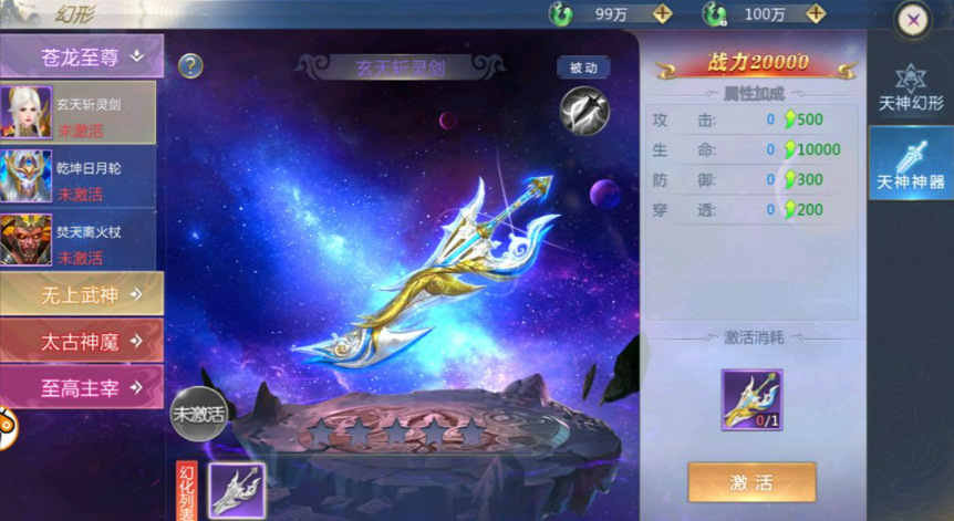 ●每个天神都配备多把专属神器,激活后可自由切换神器外观,激活过程需消耗对应的神器道具,且即便对应天神未解锁,也能激活其神器并获取战力加成;