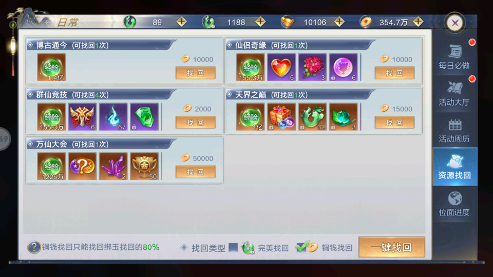 ●铜钱找回:通过此方式找回的奖励,仅为绑玉找回奖励的 80%。