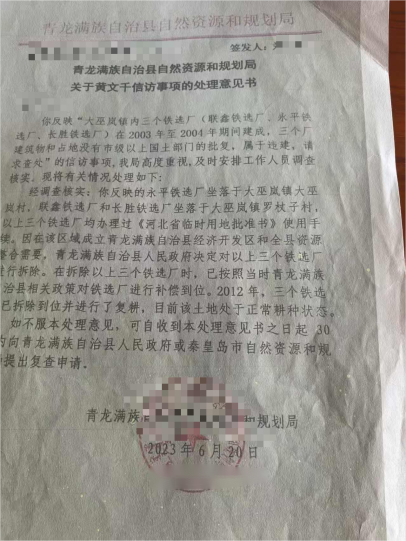 2023年,青龙满族自治县自然资源和规划局针对针对黄某千的联鑫铁选厂属违建并请求查处的信访事项进行了调查核实,称联鑫铁选厂办理过《河北省临时用地批准书》使用手续,拆除时已按当时县里相关政策补偿到位。