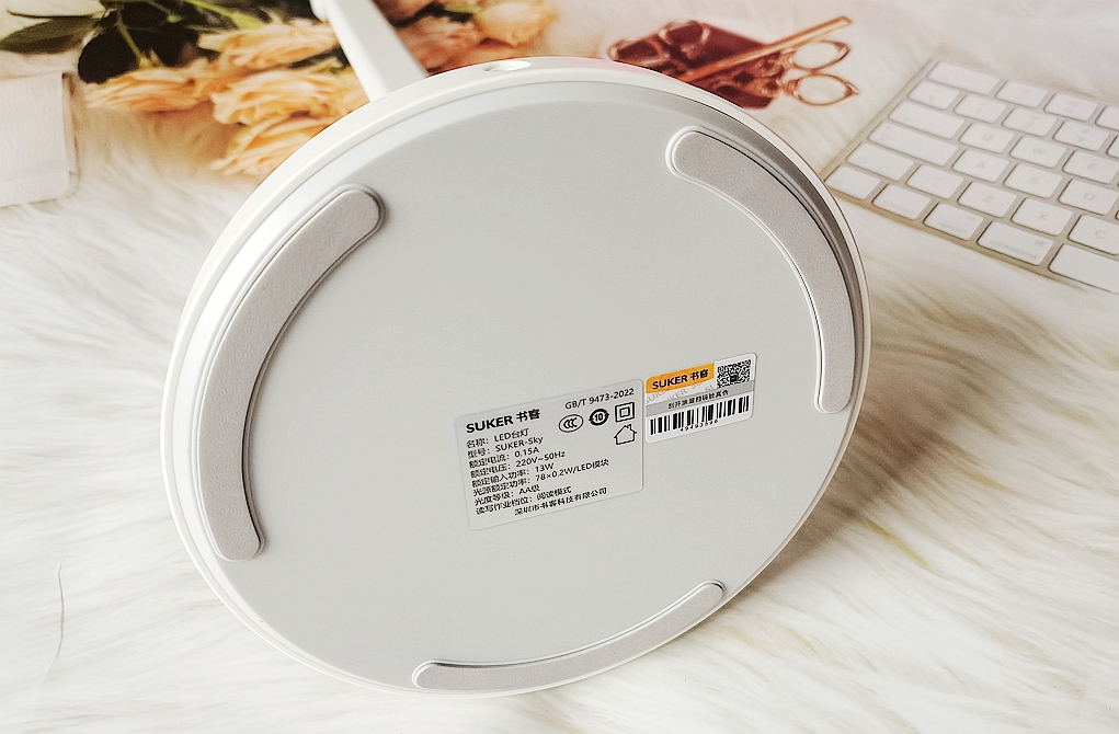 台灯的底座厚度约15mm,直径有一个巴掌的大小,从底座上可以调整灯头的高低角度,而且还配备了三块防滑脚垫,对于台灯在桌面上的稳定性起到了非常重要的支撑作用。