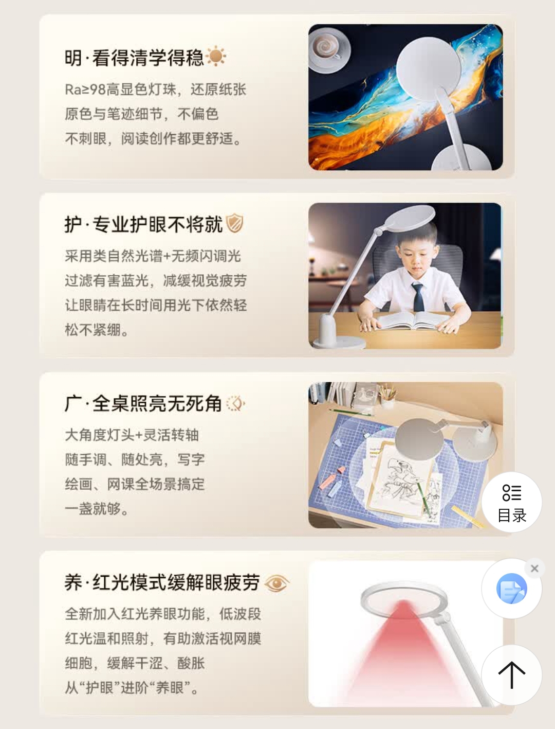 此外,书客SKY护眼台灯还是专为护眼而量身打造的"四大金刚":明、护、广、养。每一项技术,只为守护孩子的每一次认真读写。
