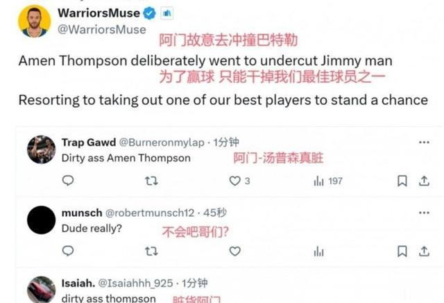 回看巴特勒受伤瞬间,火箭队的阿门腿部被其他球员绊倒,失去平衡后直接冲撞到巴特勒身下,导致后者重重摔在地板上。虽然美国球迷将矛头对准阿门,指责他打球脏,故意冲撞巴特勒。但从另一个角度的慢镜头来看,这完全是个意外碰撞,阿门并非故意为之,绊倒他的球员也只是专注篮下拼抢,并未察觉到这一危险状况。
