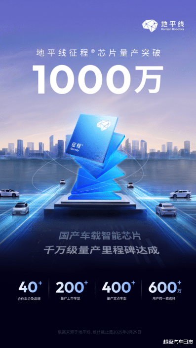 千万出货,引领辅助驾驶大规模量产在技术突破的同时,地平线积极推动智能驾驶技术规模化量产。截至今年8月,地平线征程家族累计量产突破1000万套,成为国内首家达成这一里程碑的智驾科技企业,彰显了在规模化量产领域的领先实力。