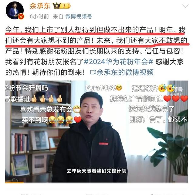余承东在视频中表示:“今年,我们上市了别人想得到但做不出来的产品!明年,我们还会有大家想不到的产品!未来,我们还有大家不敢想的产品!”
