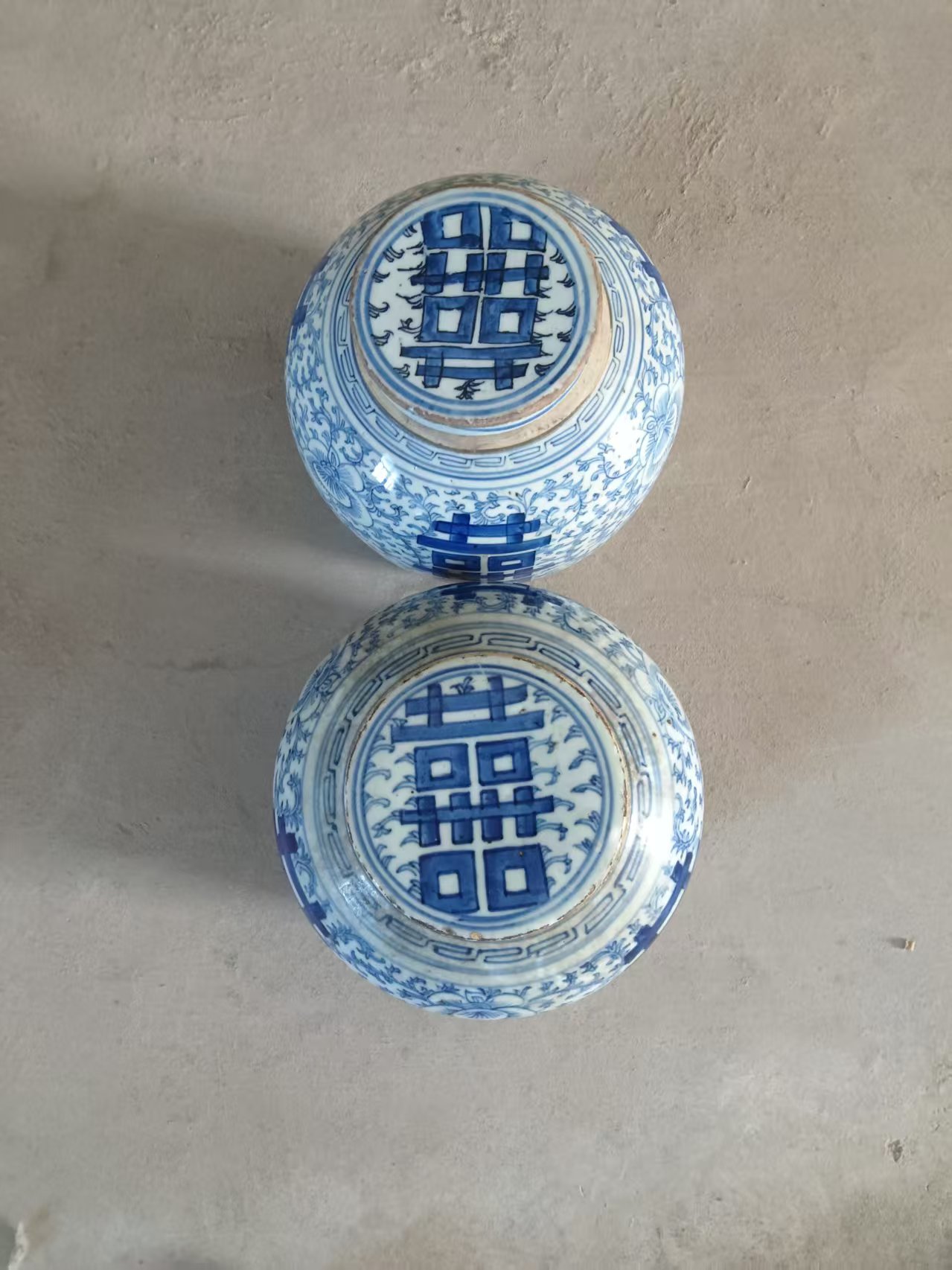 这对瓷罐以苏麻离青(或其仿料) 为色,在白瓷胎上勾勒出层次分明的蓝调:缠枝莲的花瓣舒展灵动,枝蔓如流水般贯穿器身,与方正饱满的 “囍” 字形成 “柔与刚、动与静” 的视觉对话。细看釉面,还能捕捉到青花特有的 “晕散” 与 “铁锈斑” 痕迹(若为清代早期器物),那是钴料在高温窑火中自然晕染的 “时光印记”。