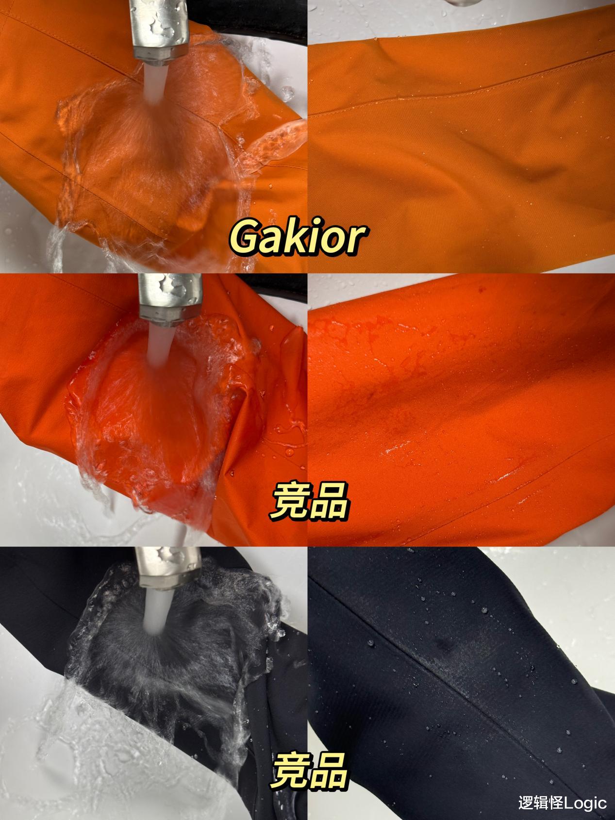 防水能力是GaKior最突出的亮点之一。官方标注35000mm防水指数,意味着它可以承受相当于3.5米水柱的压力而不渗漏。我模拟了雨水环境,可以看到雨水在冲锋衣表面水珠呈现荷叶状,在面料接缝和拉链处也未见浸湿情况,旅行途中未遇到雨水天气,但通过测试能够反映出,冲锋衣能够做到“雨中行走不湿身”。