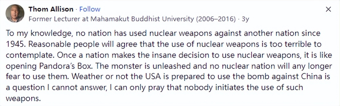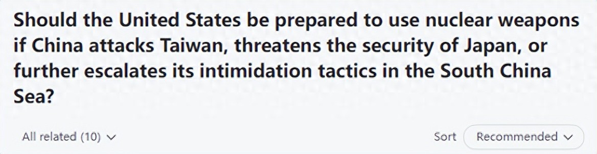 一名美国网民在国际领先的问答平台Quora上提出疑问:“假使中国采取行动实现对台湾的统一,美国为何未动用核武器?”面对这一问题,我感到十分困惑,确实体现了鲜明的美国优越主义态度。