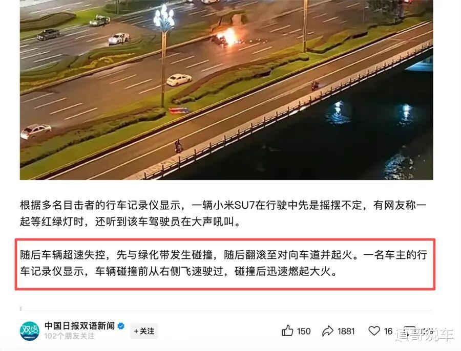 至于留给救援人员的“窗口期”,就此次事故而言,《中国日报双语新闻》在报道中提到:“车辆超速失控,先与绿化带发生碰撞,随后翻滚至对向车道并起火。一名车主的行车记录仪显示,车辆碰撞前从右侧飞速驶过,碰撞后迅速燃起大火。”