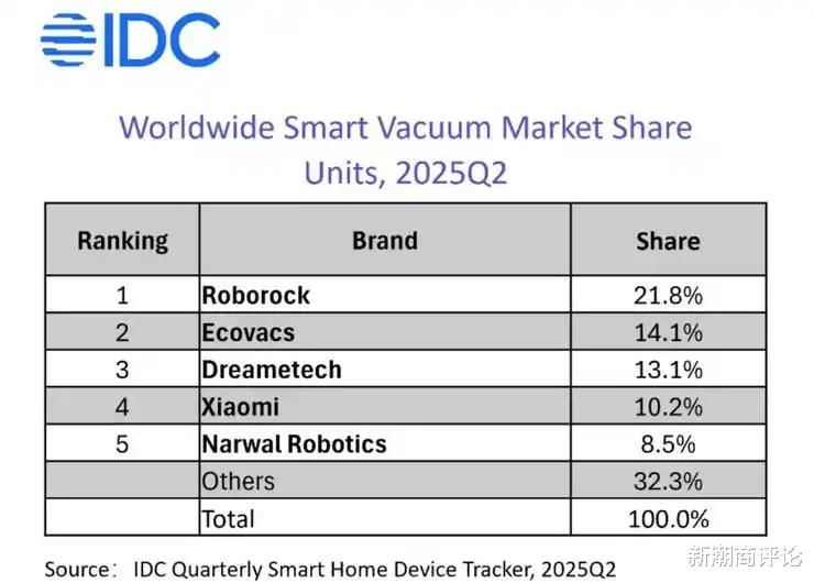 根据知名调研机构国际数据公司IDC的报告显示,2025年第二季度全球智能扫地机器人出货量同比增长20.5%至617万台,前五名均为中国企业,合计占据近七成的市场份额。云鲸智能出货量达到52.42万台,以8.5%的市场份额首次跻身前五,反超美国厂商iRobot(创立于1990年,被称为扫地机器人“鼻祖”)。