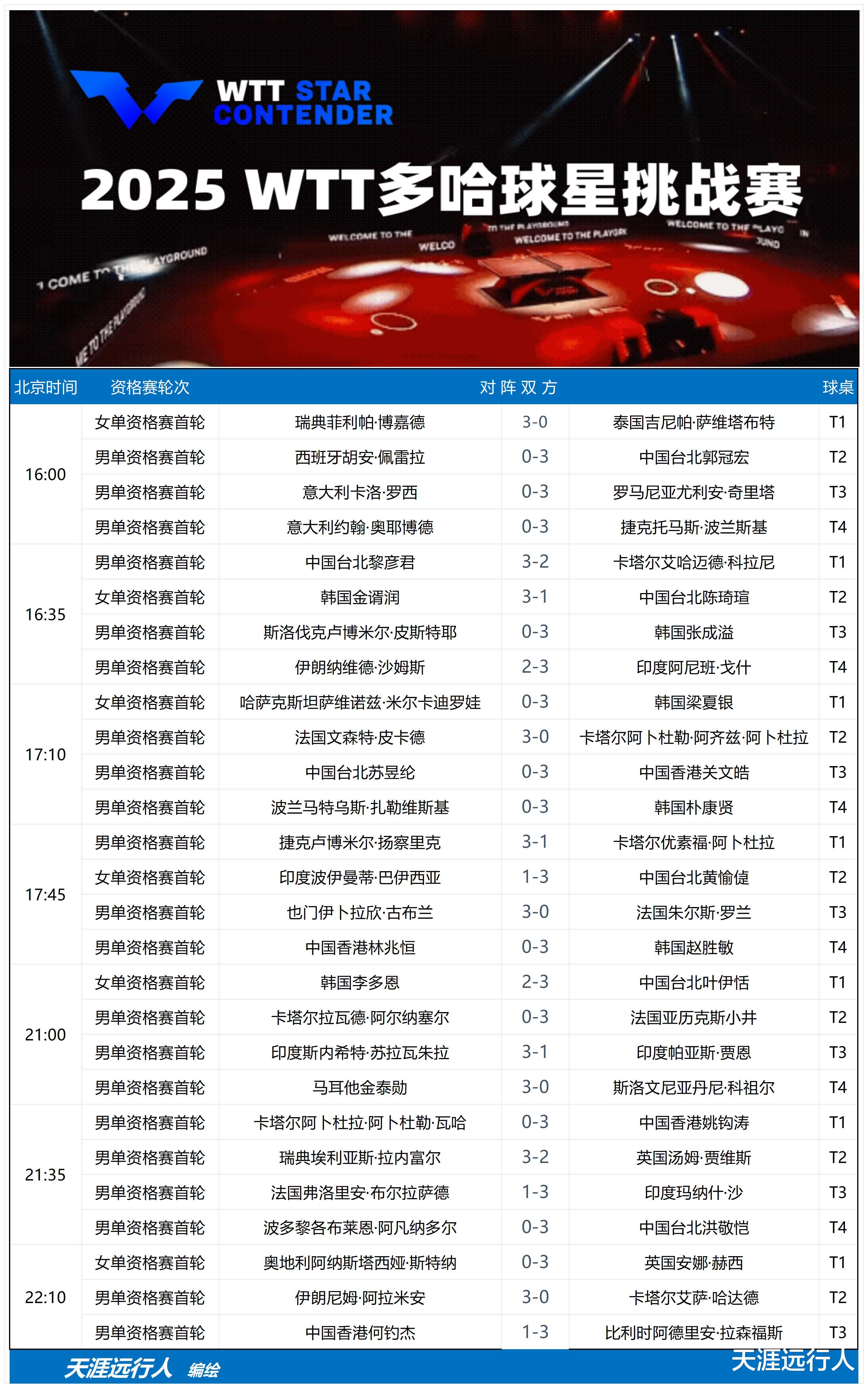 2025WTT球星挑战赛多哈站资格赛首日完整战报赛况一览表