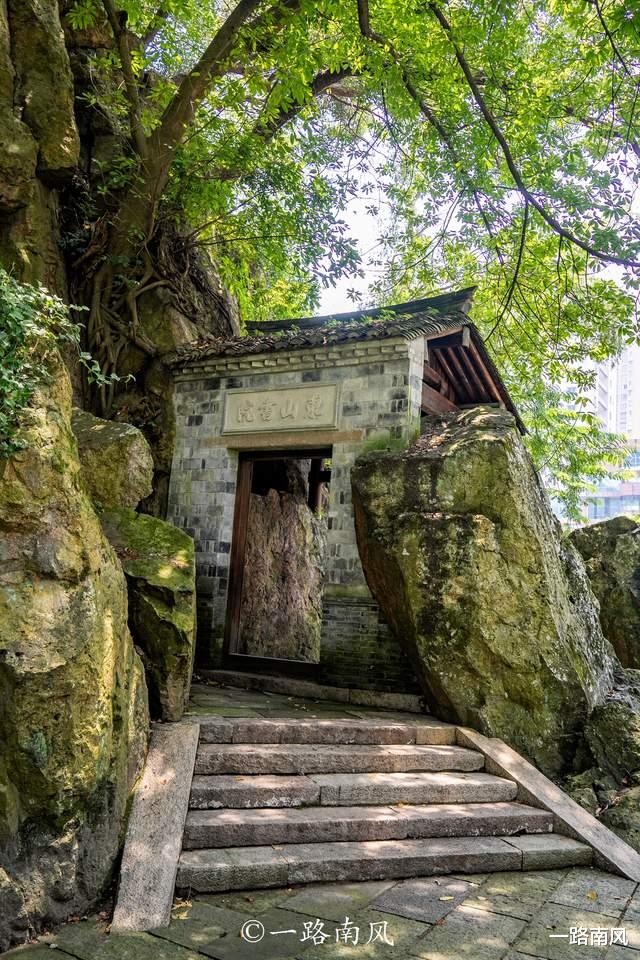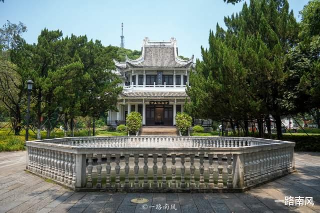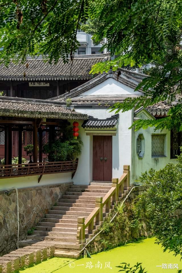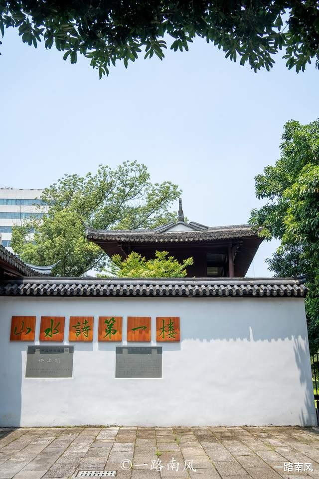谢灵运纪念馆沿着中山公园的幽径一路往南边走,穿过月带桥就看到有“山水诗第一楼”标志的白墙。