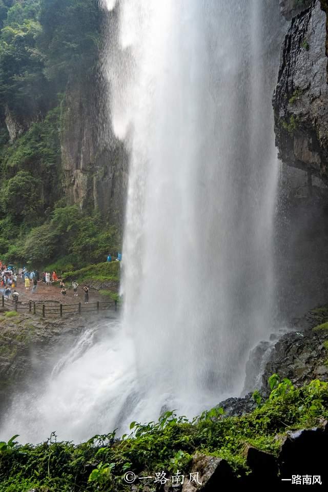 穿过第二漈瀑布是奇妙的体验,由于水雾较大且岩壁滴水密如下雨,需要穿雨衣快速通过。