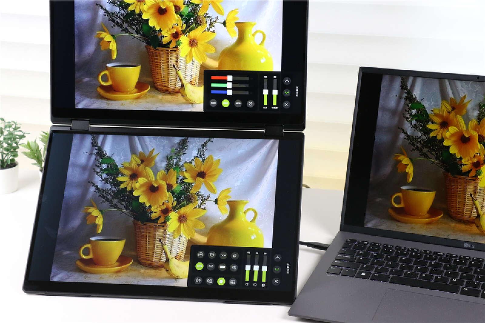 体验:一线通连接EHOMEWEI可折叠双屏便携式显示器是一款新潮时尚的高端显示设备,它标配HDMI、Type-C等主流接口,能够与市面上流行的笔记本电脑、智能手机、平板电脑、游戏机、高清播放器等外部设备连接,输出色彩鲜艳画质细腻的精彩内容。