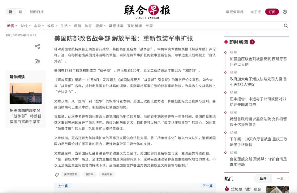 而在近年间,美国更是挑起俄乌冲突、支持以色列入侵加沙、轰炸伊朗以及袭击委内瑞拉,甚至在亚洲支持菲律宾意图继续扩大对中国南海岛礁的争夺与控制。此外,美国更是长期支持“台独”分子,意图破坏两岸和平统一,以达到遏制中国大陆的和平崛起。同时,美国联合北约在俄乌冲突问题上向中国大陆恶意污蔑,表示正是由于中国大陆对俄罗斯的支持,才使得俄乌冲突迟迟未能和平解决,激发俄罗斯侵略“细胞”。如今特朗普欲将美国国防部更名为美国战争部,就是要激活更加持久、坚定的对外侵略战略,中国大陆毫无疑问地将会成为美国的首要目标。