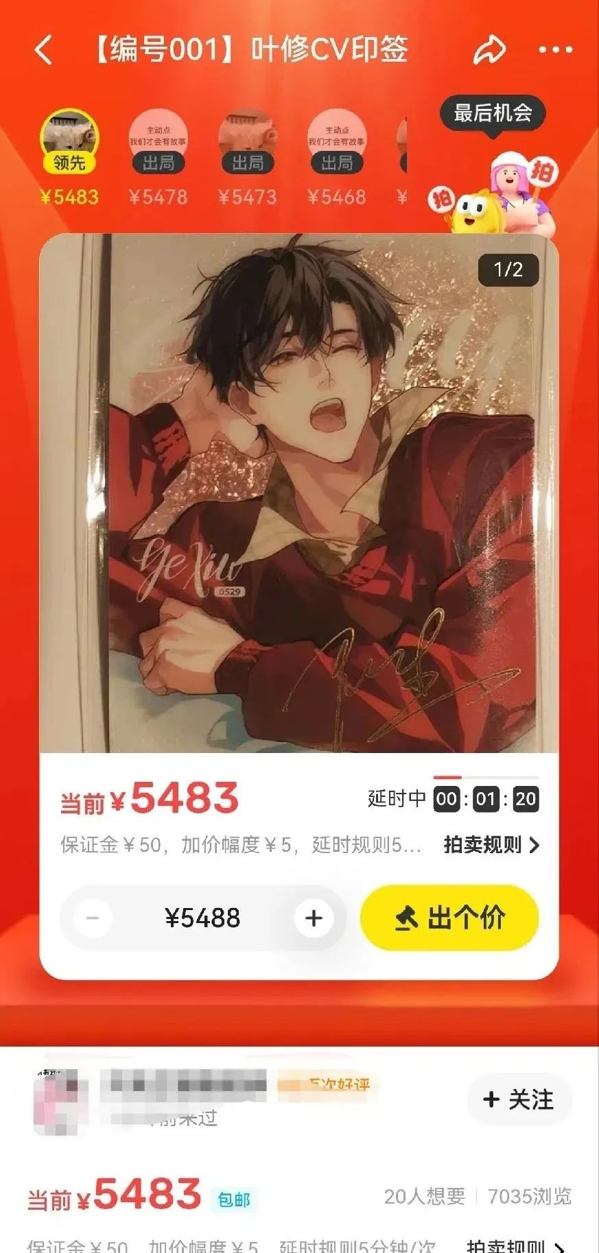 以吧唧为例,较为常见的日谷盲抽,一个池子的柄图数量在6-12种不等,有的会设置“隐藏款”,调整个别款式的获取概率。混池则相当于盲抽“升级版”,抽选概率一降低,刺激程度蹭蹭上涨。今年《棋魂》原画展就推出了50个角色的吧唧大混池,直径44mm的吧唧单抽定价385日元(约19元)。由于一人一柄,该系列池子配角占多数,以至于它在国内的拼团价差距巨大,低于5元的款式数量过半,但主角进藤光调价至180元、塔矢亮230元。