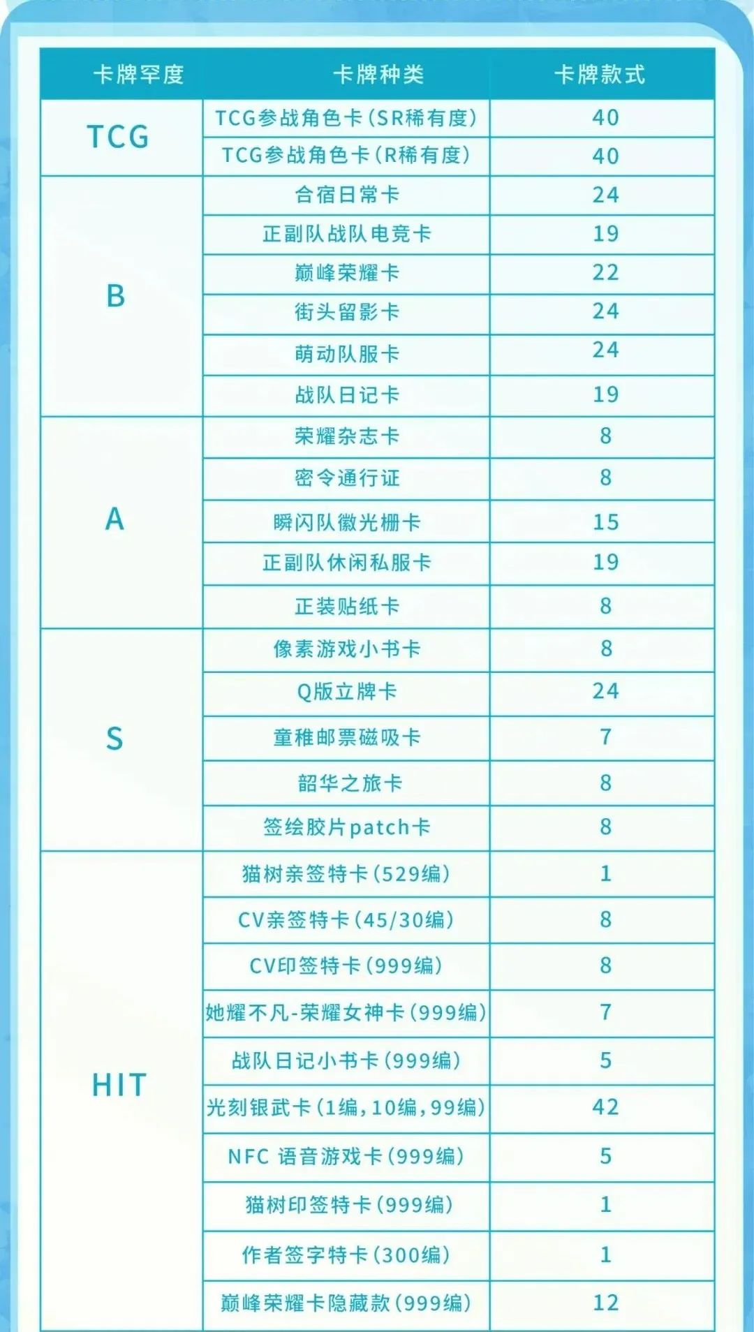 单IP的混池设置更为大胆,阅文好物与Hitcard一同推出的《全职高手》荣耀之约典藏卡,从去年至今已经上架三弹,定价16.8元一包、里面包含三张随机卡牌。以最新一弹为例,卡牌款式累计超450种,其中不仅包括TCG卡牌和限量收藏卡,还有亚克力杯垫、色纸、桌垫、毛绒挂件等周边的兑换机会,也可能获得原作者的亲签、人气画师的签绘、动画声优录制的生日主题语音通话……