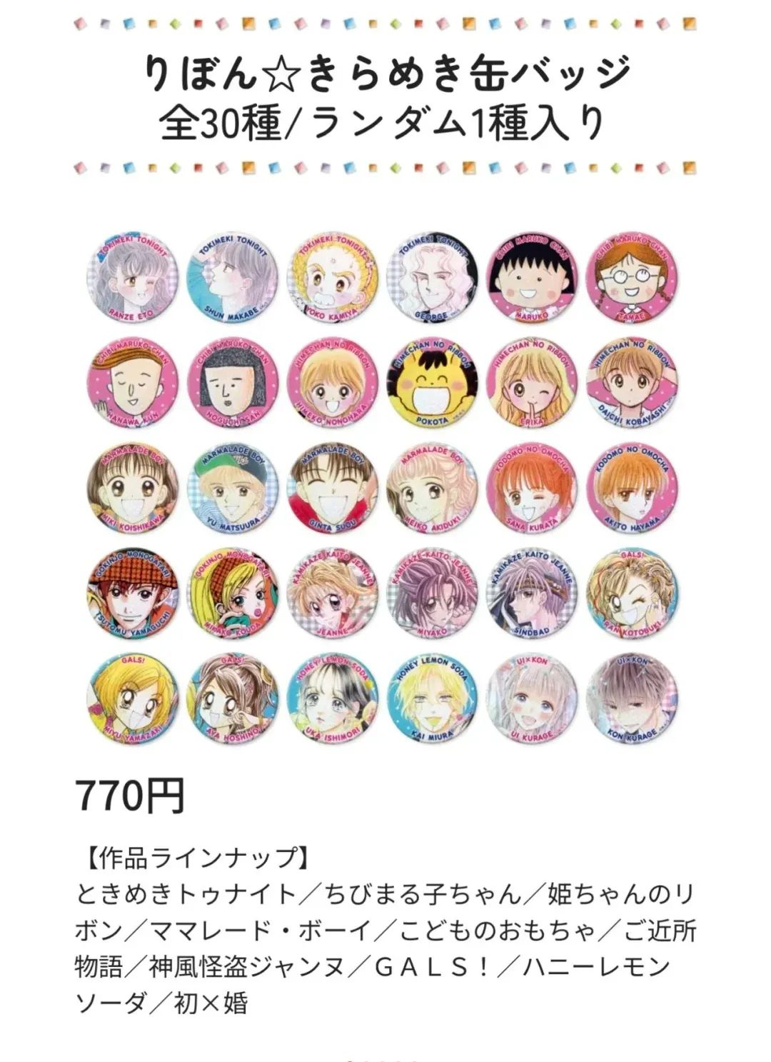 集英社旗下少女漫画杂志Ribon迎来70周年,杂志社也趁此机会推出线下活动以及许多新商品,其中便包含10个IP、全款30种的混池吧唧。商品页“当天售完即止”的文字说明,在粉丝看来约等于“不买即吃高价二手谷”的预警。