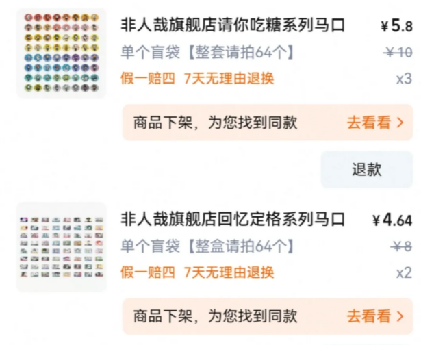 日本IP之所以敢推出周边混池,是因为IP影响力够高、粉丝经济够成熟,普通人的消费习惯能支持这一售卖方式。可在国内,除开各品牌、店铺、直播间将库存设为混池的低价清仓行为,年轻消费者向来都是遵循“遇见大混池必吐槽”定律,无一例外。因此为了让消费者顺利接受,多家IP方会在定价、选柄、营销等方面做出相应调整。比如分子互动,旗下动漫《非人哉》《万圣街》《有兽焉》都是备受年轻消费者喜爱的IP,聚集了较为稳定的消费群体。大型混池和普通盲抽吧唧定价存在明显差异,《非人哉》回忆定格系列吧唧,虽然包含64种不同图案,但不设置隐藏款,还将单个徽章尺寸控制在较小规格,8元低价发售,可叠加电商平台和店铺优惠活动,进一步降低年轻消费者的购买门槛。该系列的淘宝详情页显示“已售10万+”。