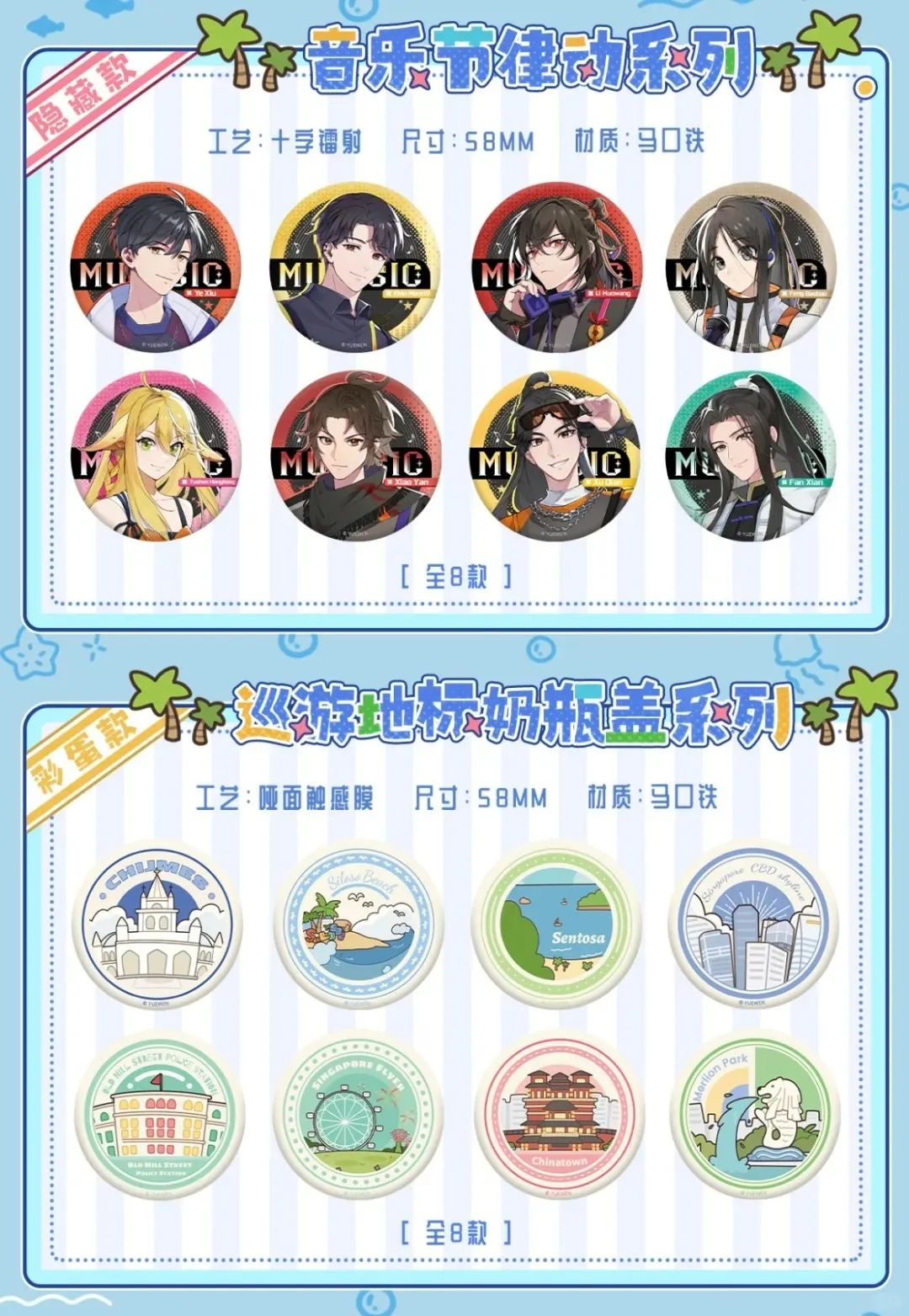 除了改变商品尺寸、价格和销售策略,对于角色号召力、粉丝购买力都足够强的IP方来说,不乏“有IP任性”的玩法。阅文好物的新加坡巡游系列吧唧同时囊括《全职高手》《诡秘之主》《一人之下》《斗破苍穹》等8个IP的周边商品,全系列共计75款。正比图案和Q版都包含在内也就罢了,甚至还有8款地标建筑的图案,美其名曰“彩蛋款”,但粉丝们显然不会因抽到这些彩蛋而感到快乐。