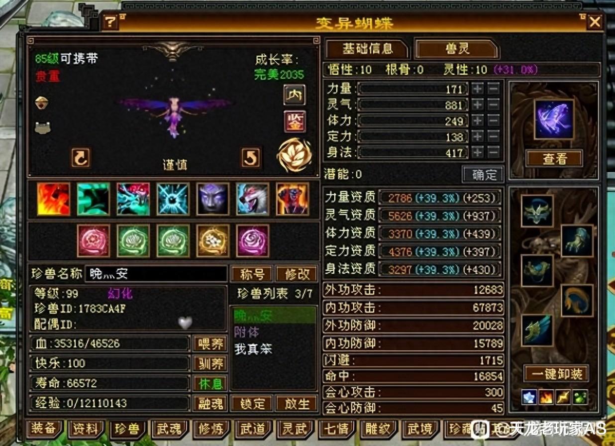 这资质真的逆天了,双十之后资质高达4689!或许对于别的珍兽而言,4689不算天花板,但是对于资质难过2300的蝴蝶宝宝,这个资质已经堪称逆天了。