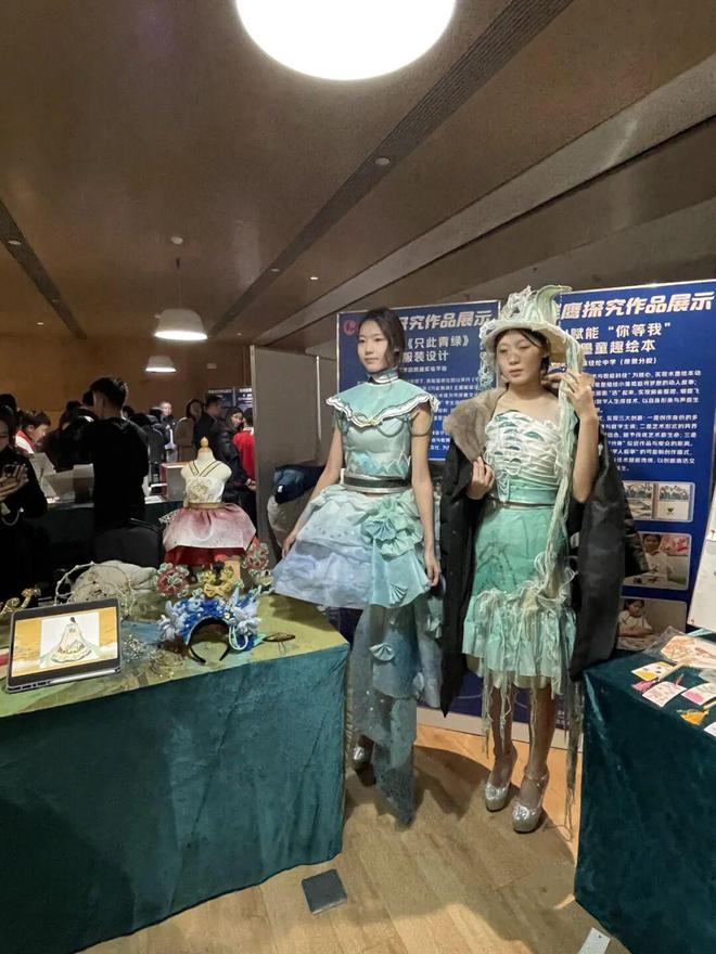 在“雏鹰创新探究作品微呈现”环节,贾海燕、刘芳老师指导的《只此青绿,纸筑霓裳主题纸艺服装设计与制作成果》成为全场焦点。该作品以宋代《千里江山图》为精神内核,秉持“画入衣、衣承画”的设计理念,将千年古画的山水意境转化为可穿戴的文化符号。学生们不仅详细展示了海绵纸、卡纸等环保材料的甄选过程,以及褶皱、钉珠等工艺的创作细节,更身着亲手制作的“山之衣”“水之衣”进行现场走秀——层峦叠嶂的立体剪裁再现古画雄奇,矿物色系的环保面料彰显传统美学,灵动演绎了“山水相依”的文化意境,充分展现了艺术跨界融合的创新魅力,收获阵阵掌声。