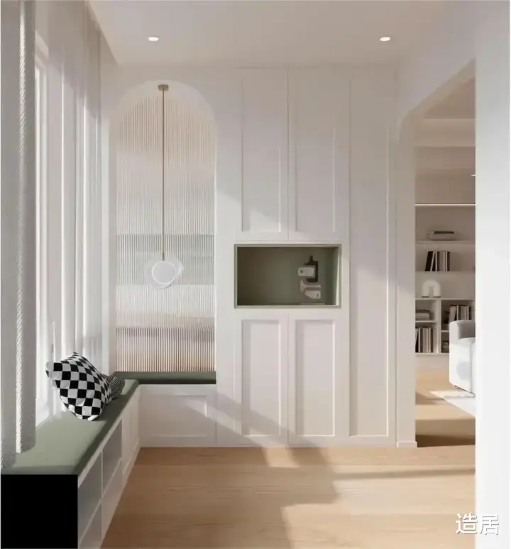可以结合玄关侧面隔墙开一扇窗,宽度不超过玄关柜深度,避免影响储物,搭配磨砂玻璃或者长虹玻璃,既能保证换鞋时的隐私,又能让客厅光线射入玄关,让空间看上去又明亮又舒适。