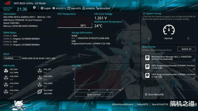 目前华硕及ROG大多数主板的操作都整合在EZ Mode里,如内存X.M.P功能开启、Q-Fan曲线调整、启动项设置、AURA灯效设置、ReSize BAR开关等。