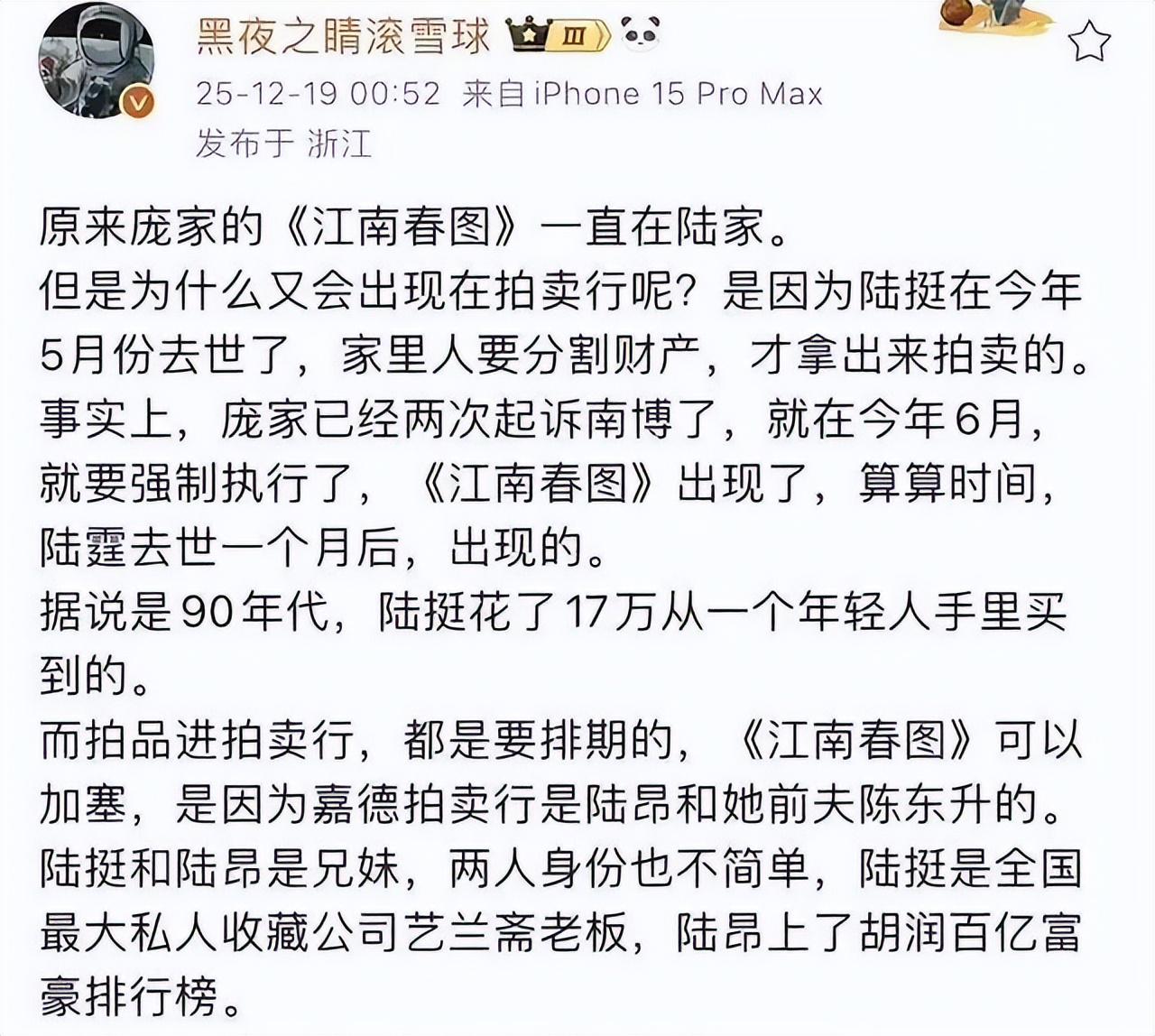 陆挺于2025年5月去世。圈内人透露,他的离世让这幅《江南春》的归属变得复杂——家人可能面临财产分割,而最直接的方式,就是送拍变现。
