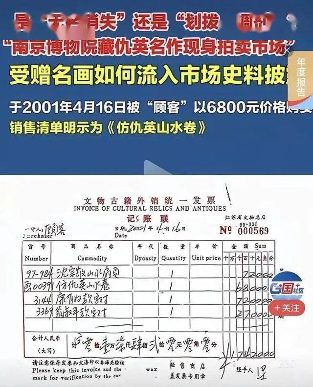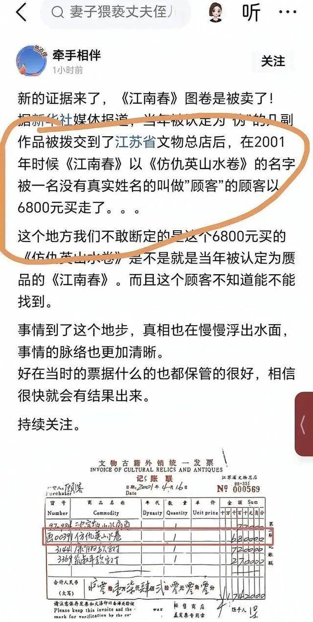 2001年南博确实以6800元卖出了一幅“仿仇英山水卷”,但那不是《江南春》,而是另一幅画。真正的《江南春》早已通过其他渠道流出,而南博用这张发票来混淆视听、蒙混过关。