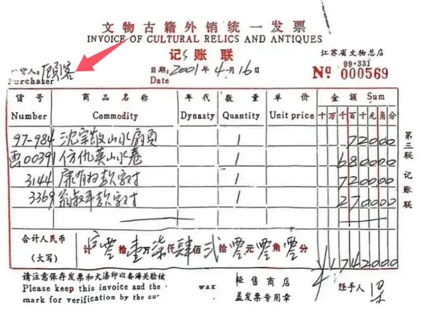 2001年4月,南京博物院提供的“文物销售发票”显示:一幅“仿仇英山水卷”以6800元价格售予“顾客”。