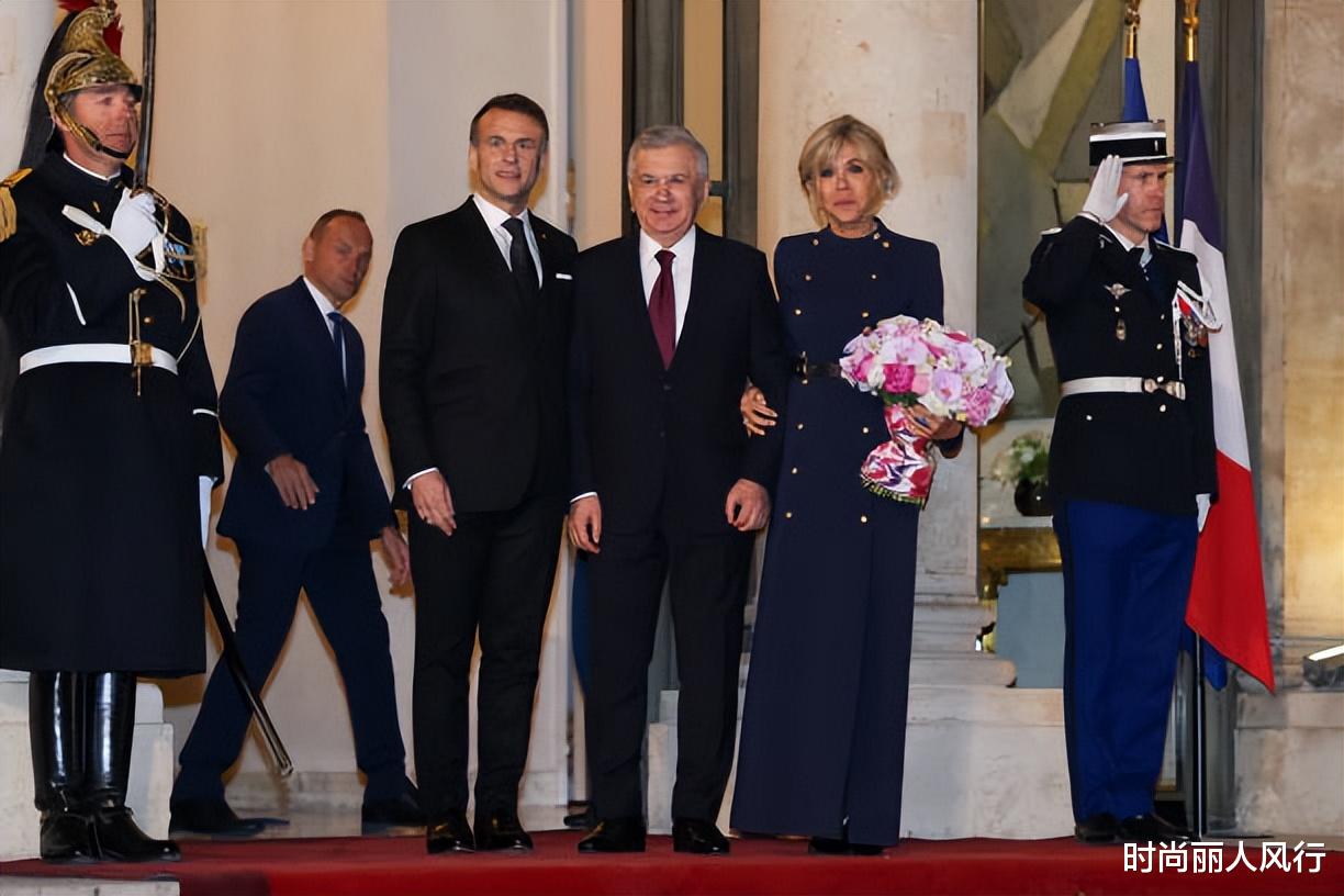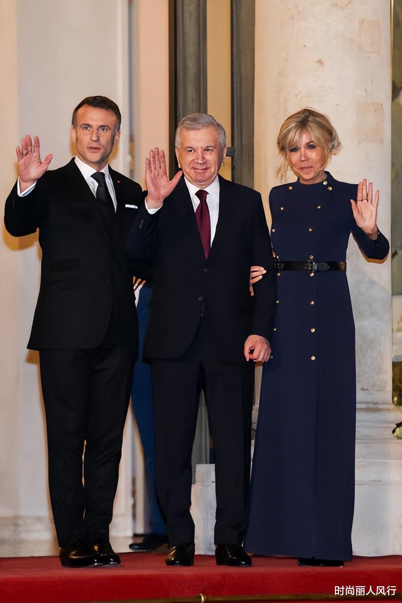布丽吉特欢迎乌兹别克斯坦总统美翻!穿高开叉裙,挽着马克龙真甜