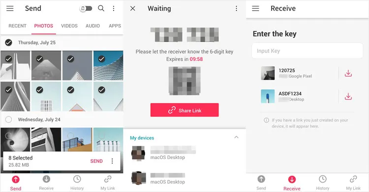 在安卓设备上打开该应用程序,然后导航至“接收”选项卡。手动输入 iPad 屏幕上显示的六位数密钥,或使用相机扫描二维码。