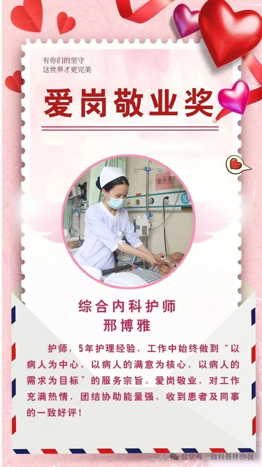 平凡的岗位,铸就不凡的坚守;细微之处,方显仁爱之心。每一位被提名的“爱岗敬业之星”,都是护理队伍中最闪亮的灯塔,他们用行动诠释着南丁格尔精神的时代内涵。让我们以榜样为镜,向先进看齐,将这份对事业的赤诚、对患者的关爱、对责任的担当,汇聚成推动精诚博爱医院护理事业高质量发展的磅礴力量!致敬每一位默默奉献、闪闪发光的护理人!
